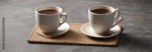 Richly textured burlap coaster with a delicate coffee cup on a granite surface, beans, grain, warm