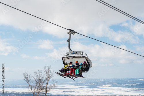 Riders climb the slope with the help of a ski lift