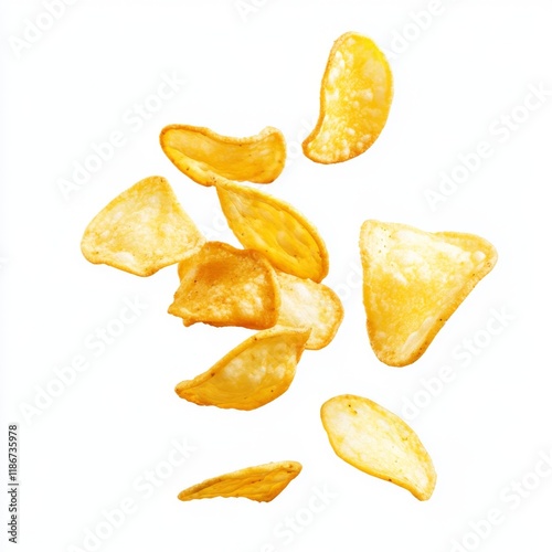 Ridiculous flying potato chips isolated on white background with transparent PNG effect.