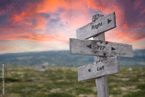 right left text quote on wooden signpost outdoors in nature. Pink dramatic skies in the background.