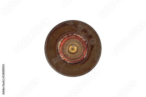 Rim of used firearms cartridge 5,56 x 45 isolated on white background.