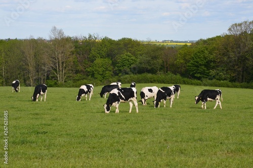 Rinder grasend auf der Weide im Frühling - Kuhherde