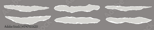 Rip paper page in light beige color on grey background. Thin strip of sheet