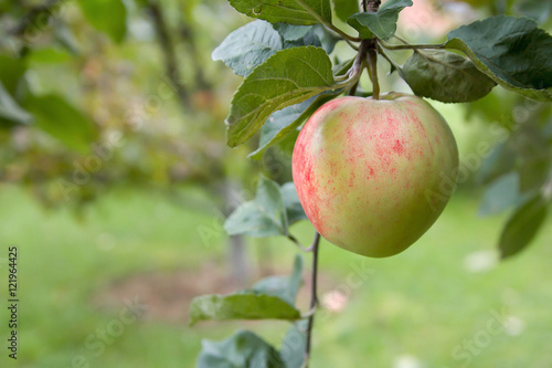 Ripe apple hanging on a branch. Close-up.
