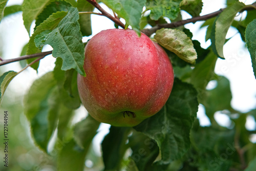 Ripe Apples in the Apple Orchard before Harvesting. Big Red delicious Apples Hanging from a Tree Branch in the Fruit Garden at Fall Harvest. Basket of Apples. Autumn Cloudy Day, Soft Shadow. 4K