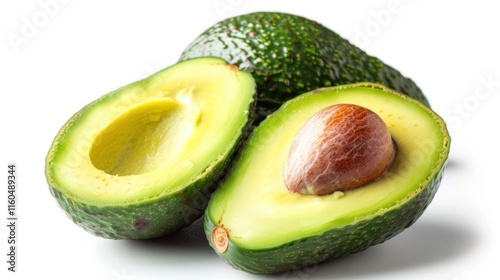 Ripe avocados, one halved showing seed, another beside it, isolated on white.