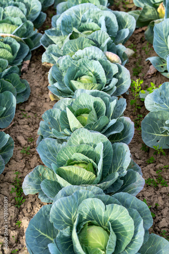 Ripe cabbages in an agricultural vegetable field before harvesting.