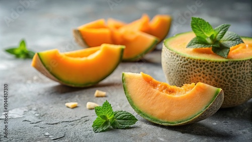 Ripe cantaloupe melon pieces on gray concrete background. Selective focus, asymmetrical composition