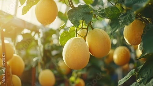 Ripe cantaloupe melons grow in a greenhouse, illuminated by sunlight. Ideal for food, agriculture, or healthy eating content creation.
