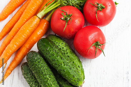 Ripe carrots, tomatoes, cucumbers in the fruit and vegetable market