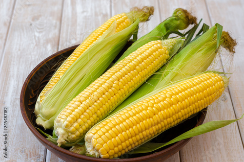 Ripe corn in a clay bowl.