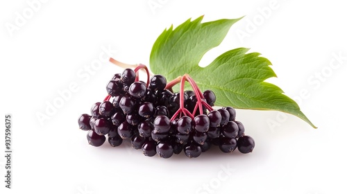 Ripe Elderberry Cluster on White Background with Fresh Green Leaves