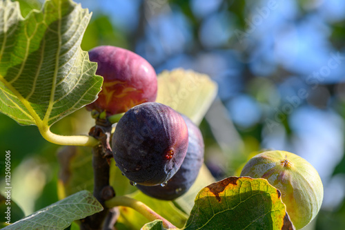 Ripe figs glisten under the sun amidst lush green leaves in a serene garden setting