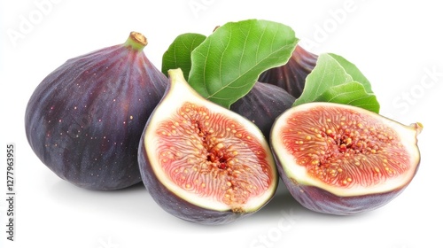 Ripe figs with a sliced piece on a white background. Clear and sharp image