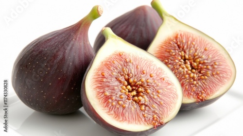Ripe figs with exposed flesh showcase seeds and texture. Ideal for food blogs recipes or culinary websites.