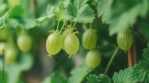 Ripe green grapes hang from a vine with small white tendrils.