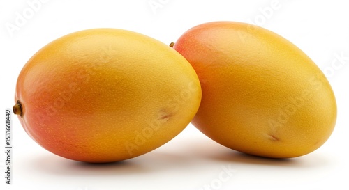 Ripe juicy mangoes gleam brightly against a stark white background. AI Generated