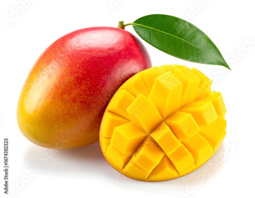 Ripe mango fruit displaying juicy slices and vibrant colors on white surface