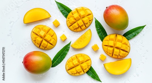Ripe Mangoes And Cut Pieces With Leaves On White Background variation 3