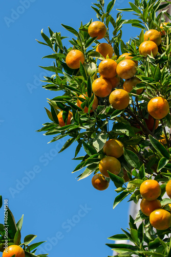 Ripe of fresh juicy orange mandarin in greenery on tree branches. Natural outdoor food background. Tangerine sunny garden with green leaves and citrus fruits.