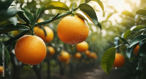 Ripe orange hanging on tree, sunlit citrus orchard, golden hour glow, bokeh light effects, lush green leaves, vibrant fruit, closeup photography, shallow depth of field, organic farming, juicy tangeri