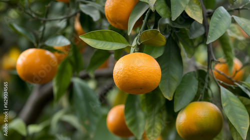 Ripe oranges hanging from a tree branch with green leaves in natural sunlight