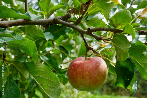 ripe organic apples on tree and grass