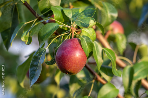 Ripe organic pears on a tree branch in the garden.