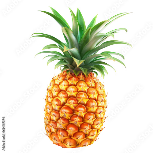Ripe pineapple with vibrant green leaves. A whole, fresh pineapple, with a golden-orange rind and bright green leaves. It appears realistic and appetizing