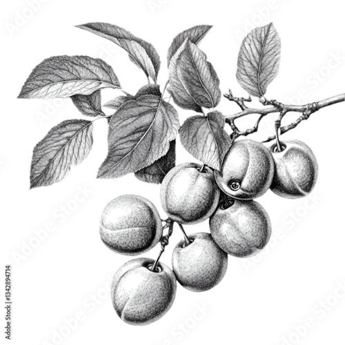 Ripe plums fruits with green leaves isolated on white and transparent background. PNG cutout.