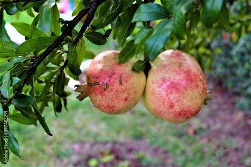 Ripe pomegranate fruit on tree branch in the garden. Colorful image with place for text, close up. Israeli New Year symbol. ripening on the tree with green leaves. It is called "Nar Agaci" in Turkish.