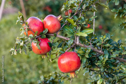Ripe pomegranates fruit hanging on a tree branch in the garden