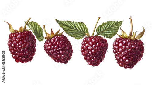 Ripe raspberries with green leaves isolated on a transparent background