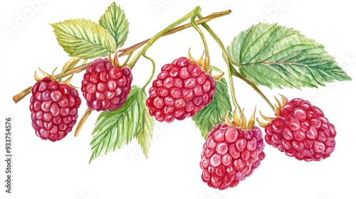 Ripe raspberries with green leaves on a white background illustrated in watercolor