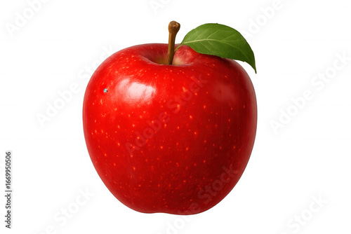 Ripe red apple hanging with green leaf, cut out for seamless graphic design compositing