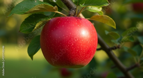 Ripe red apple hangs gently bathed in warm sunlight. AI Generated