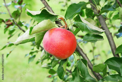 ripe red apple on an apple tree branch in the garden