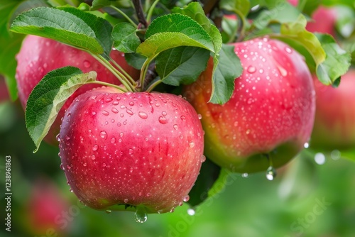 Ripe red apples covered with rain drops hanging on a branch in an orchard