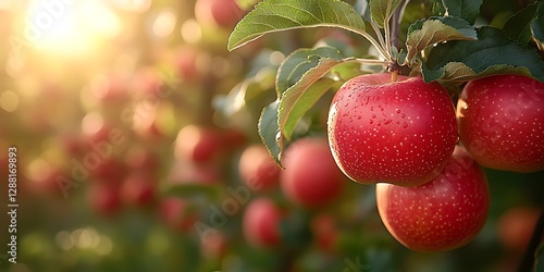 Ripe Red Apples Hanging on Branches in Orchard at Sunset