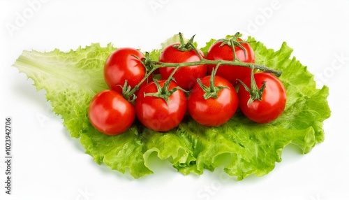 Ripe red cherry tomatoes bunch on green lettuce leaf isolated on white background. Fresh vegetables ingredients.