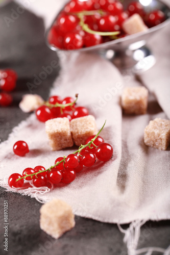 Ripe red currants with lamp sugar on table with sackcloth, closeup