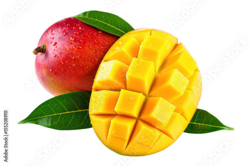Ripe red mango whole and cut into cubes with green leaves fruit tropical