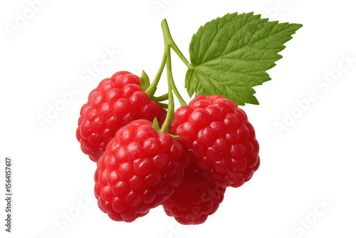 Ripe red raspberries displaying vivid color, single green leaf, transparent backdrop highlighting fresh, glossy surface