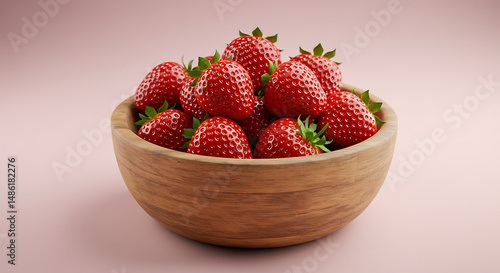 Ripe strawberries overflowing from a wooden bowl against a soft pink backdrop