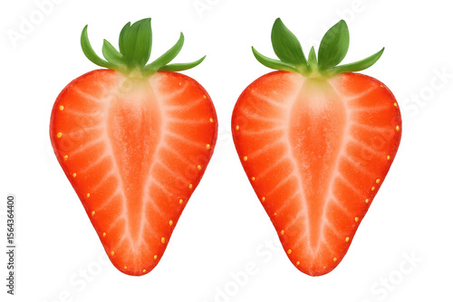 Ripe strawberry halves revealing vibrant red flesh, highlighting natural texture against clean transparent surface
