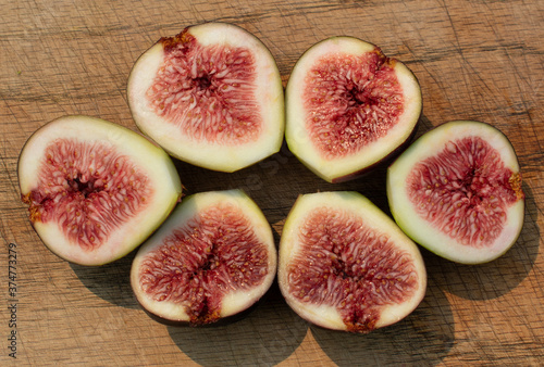 Ripe, Succulent Figs sliced in half on a wooden cutting board