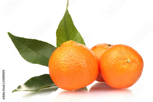 Ripe tasty tangerines with leaves isolated on white