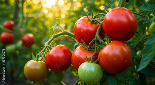 Ripe Tomatoes on the Vine - Juicy red tomatoes growing on a vine in a lush garden, bathed in warm sunlight