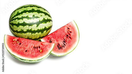 Ripe watermelon with two slices showcasing its juicy red pulp, creating a refreshing summer image on a clean white background
