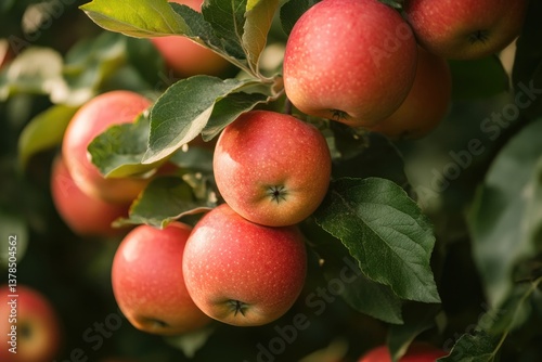 Ripening apples hang amidst lush green leaves, showcasing nature